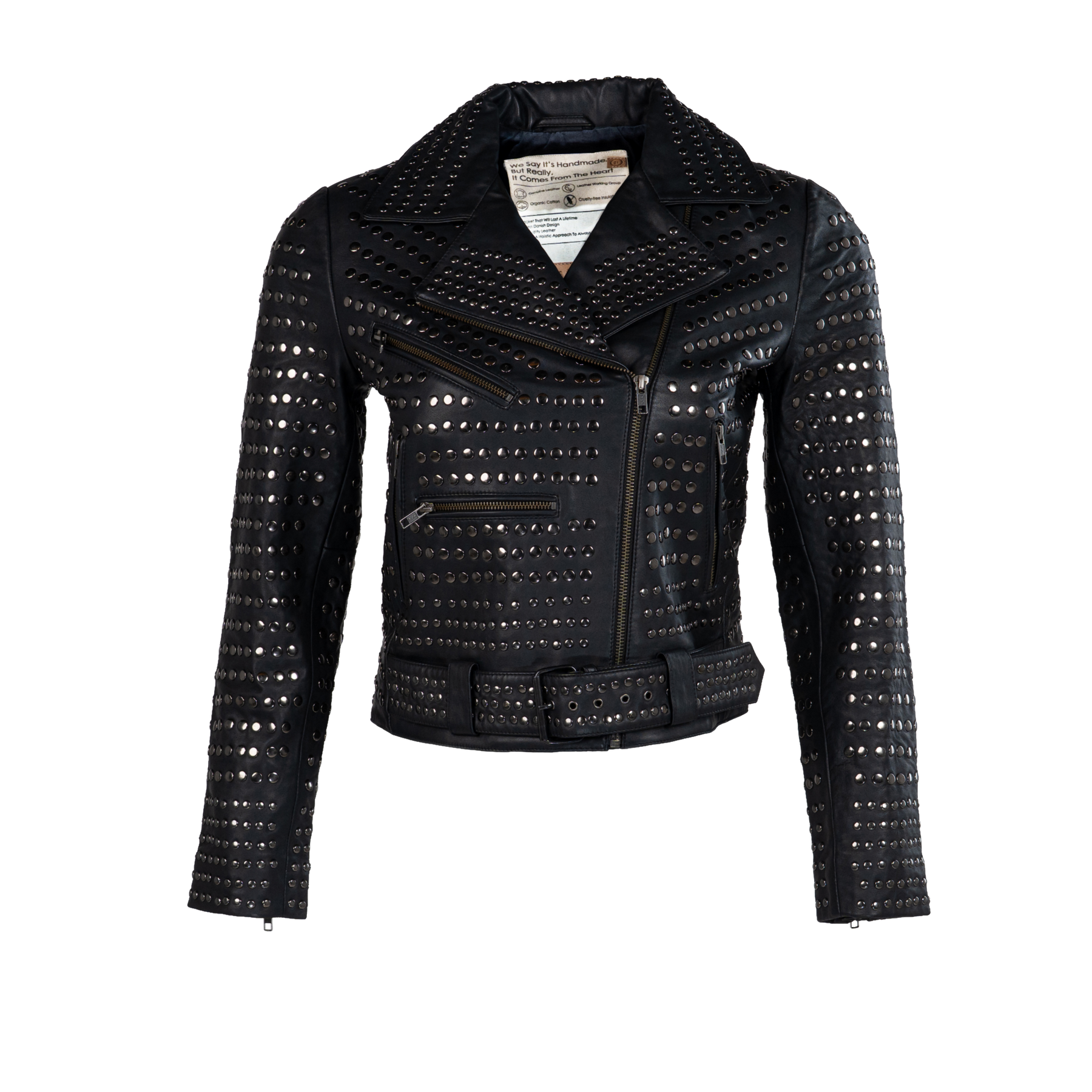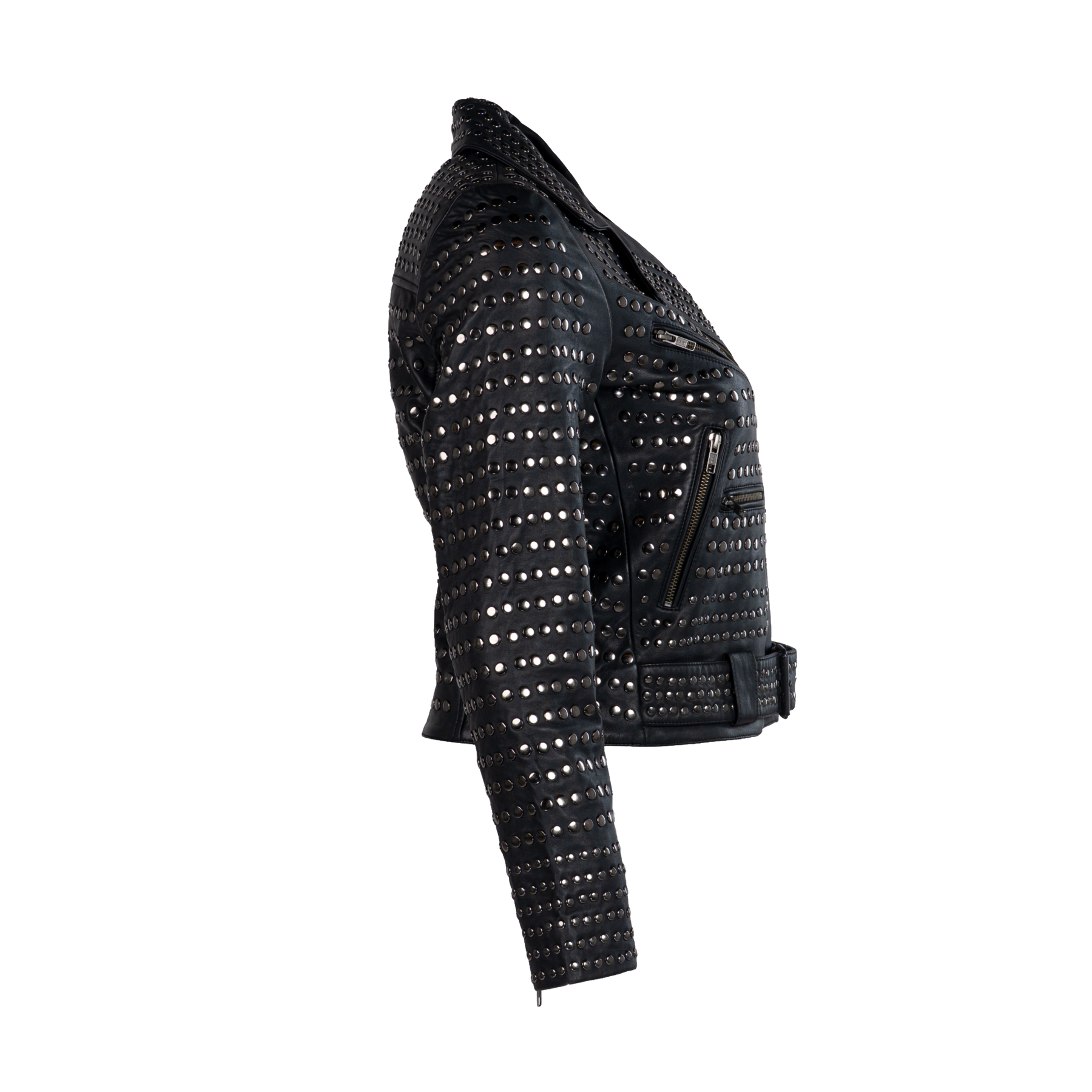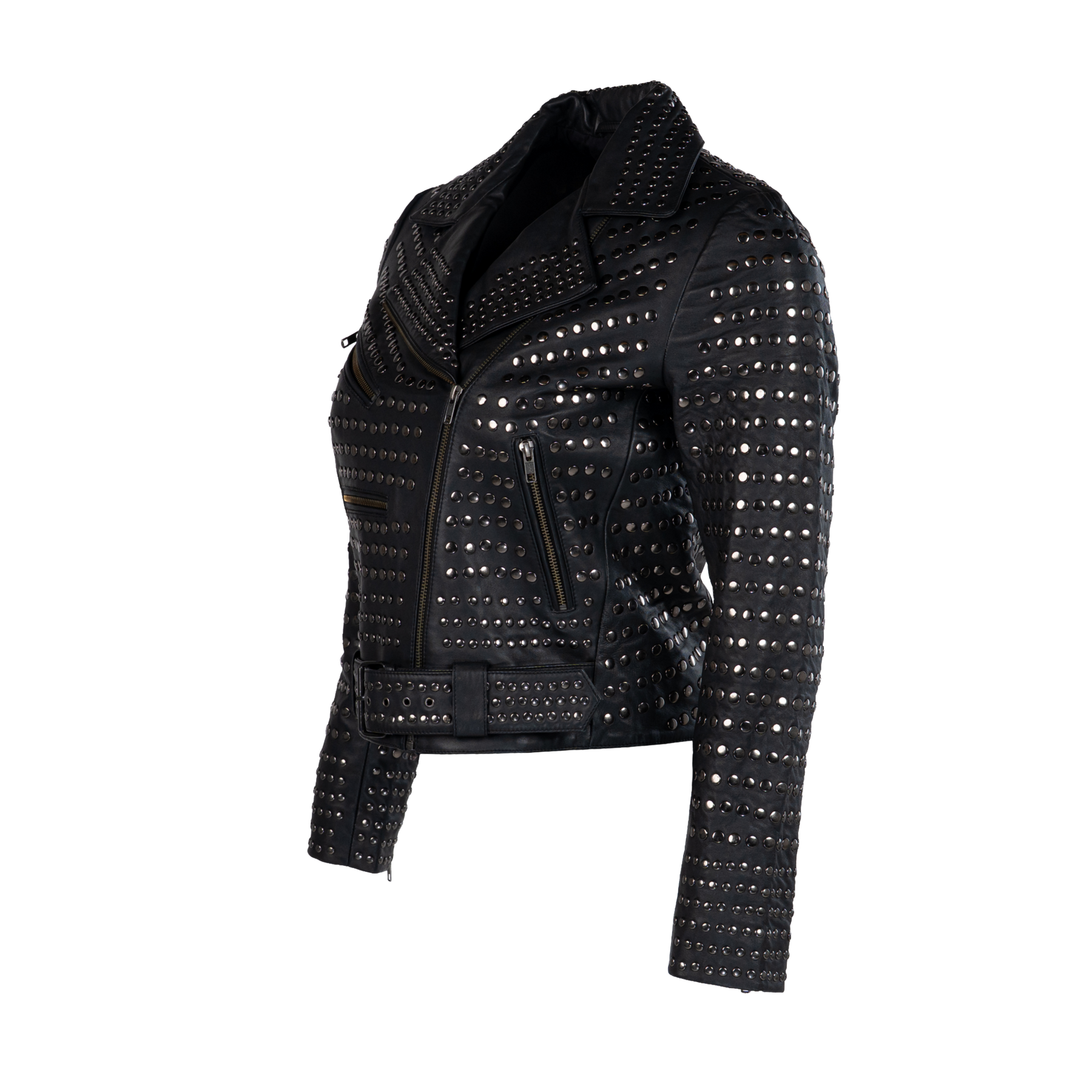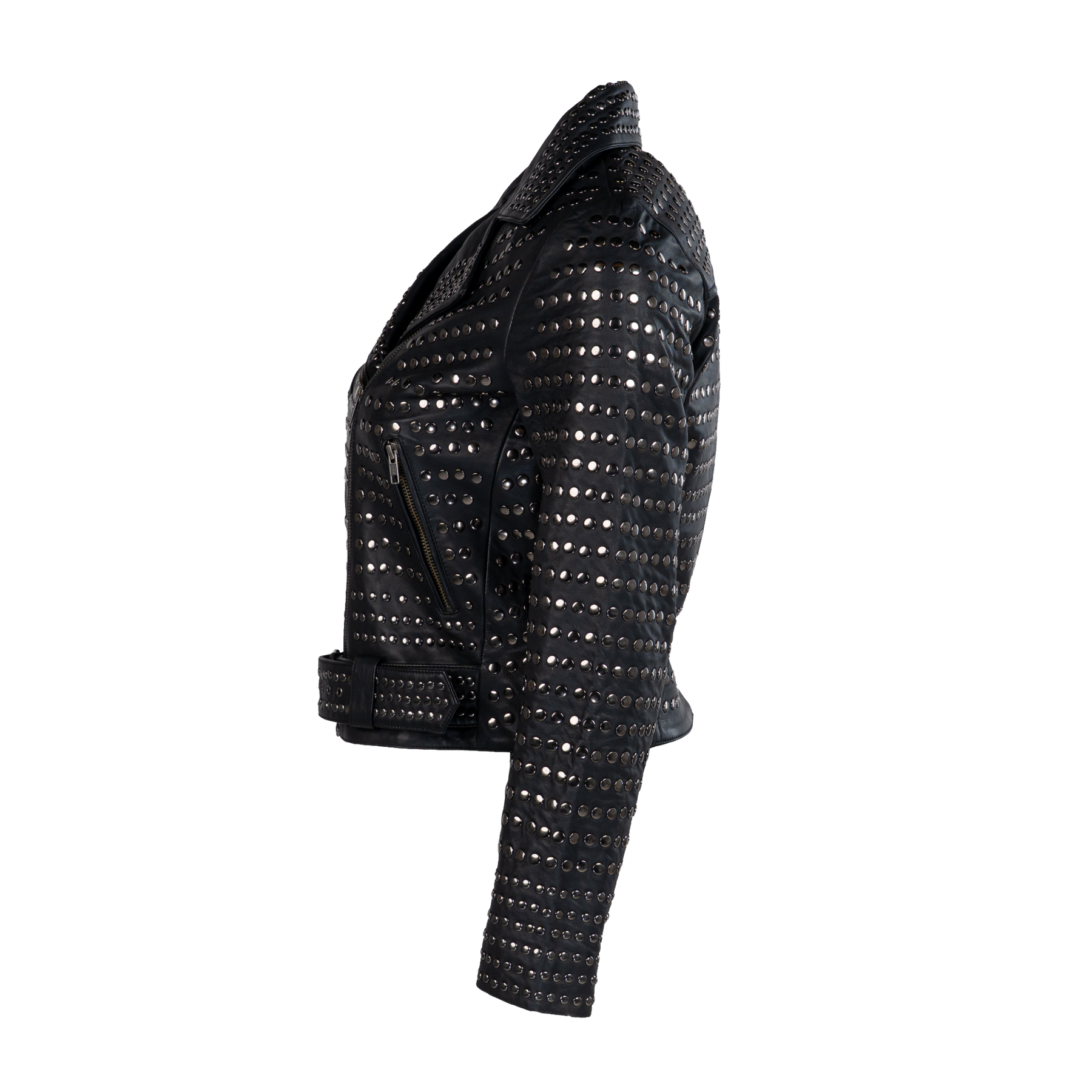 The stillFrida LS Leather Stud Jacket is a stylish women’s jacket, crafted from soft leather for a comfortable and exclusive feel. It features an asymmetrical zip closure, a lapel collar, zippered pockets, a small buttoned pocket, and an adjustable belt. The jacket is adorned with allover studs, adding an edgy detail. Inside, the jacket has one open pocket for practical storage. Finished with slits and zippers on the sleeves, this jacket makes a confident statement for both everyday and evening wear.
