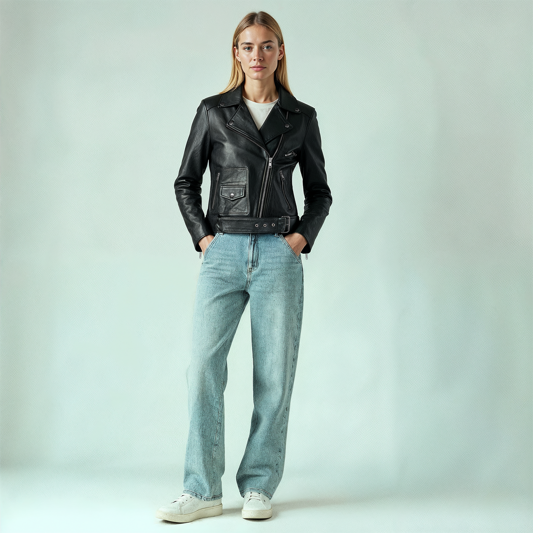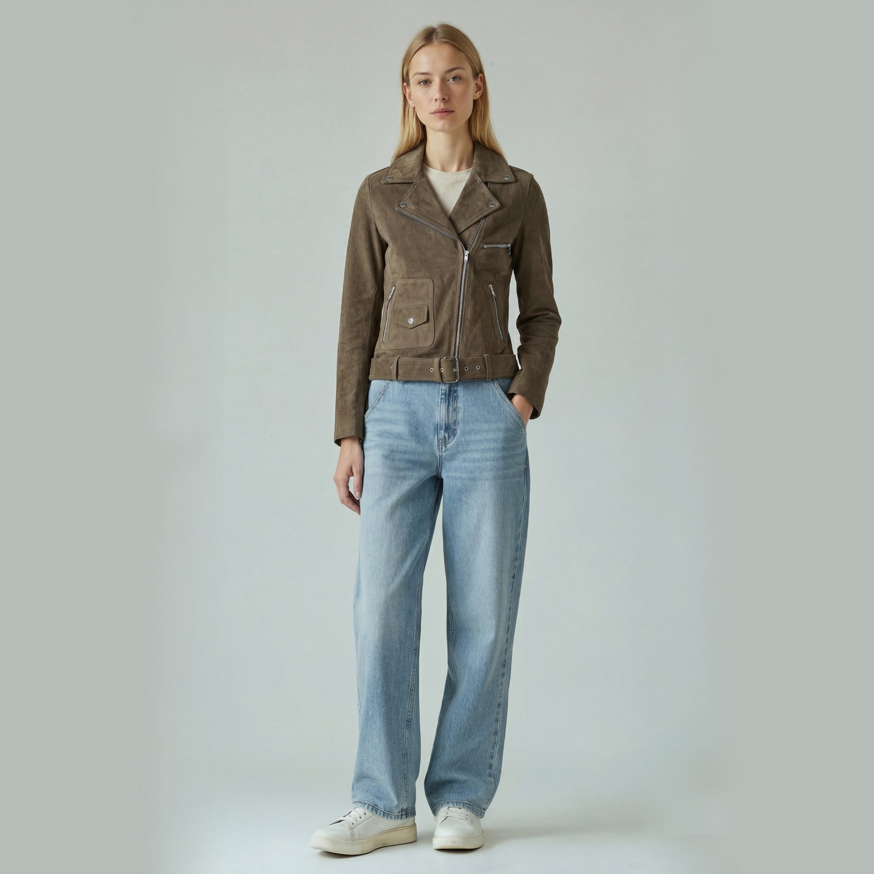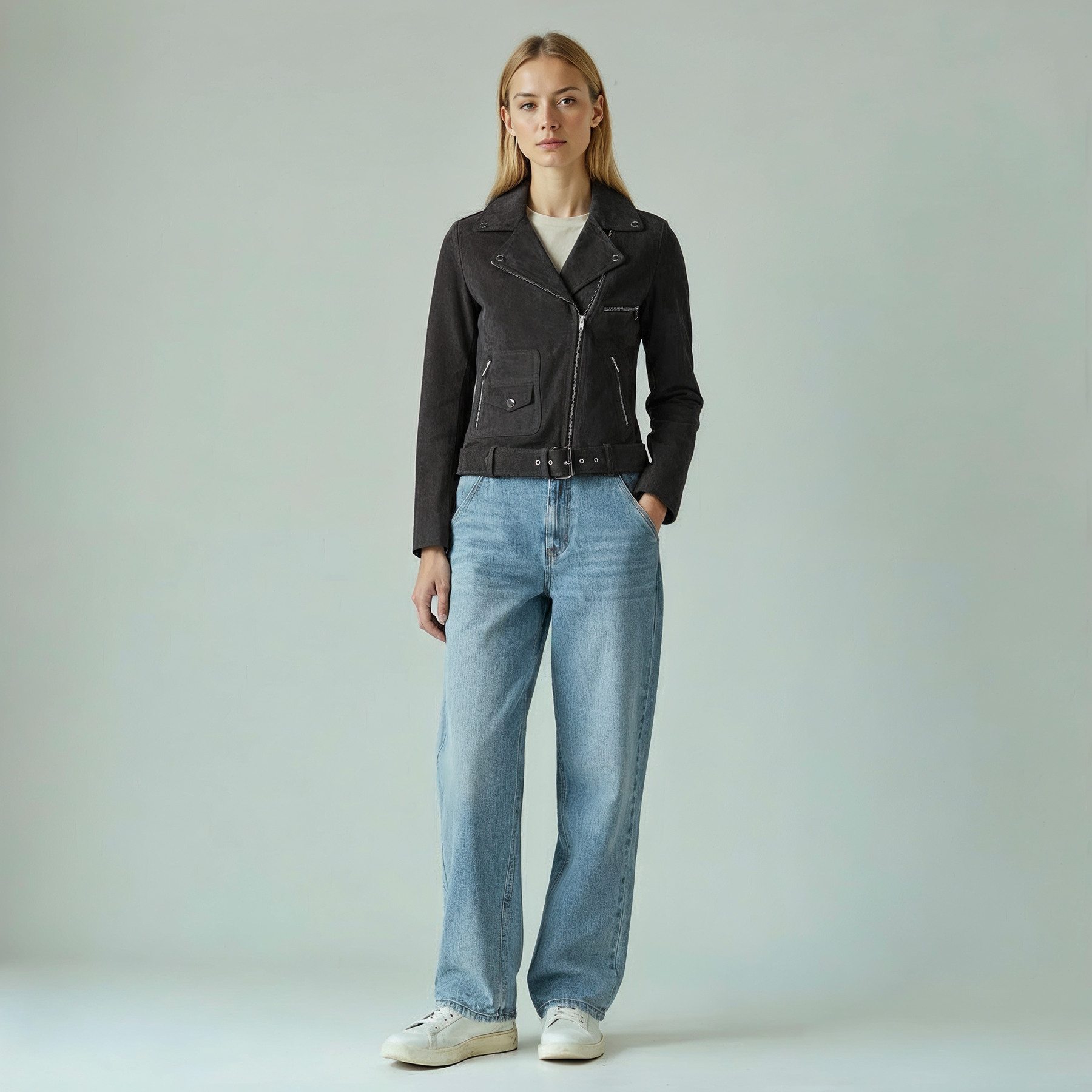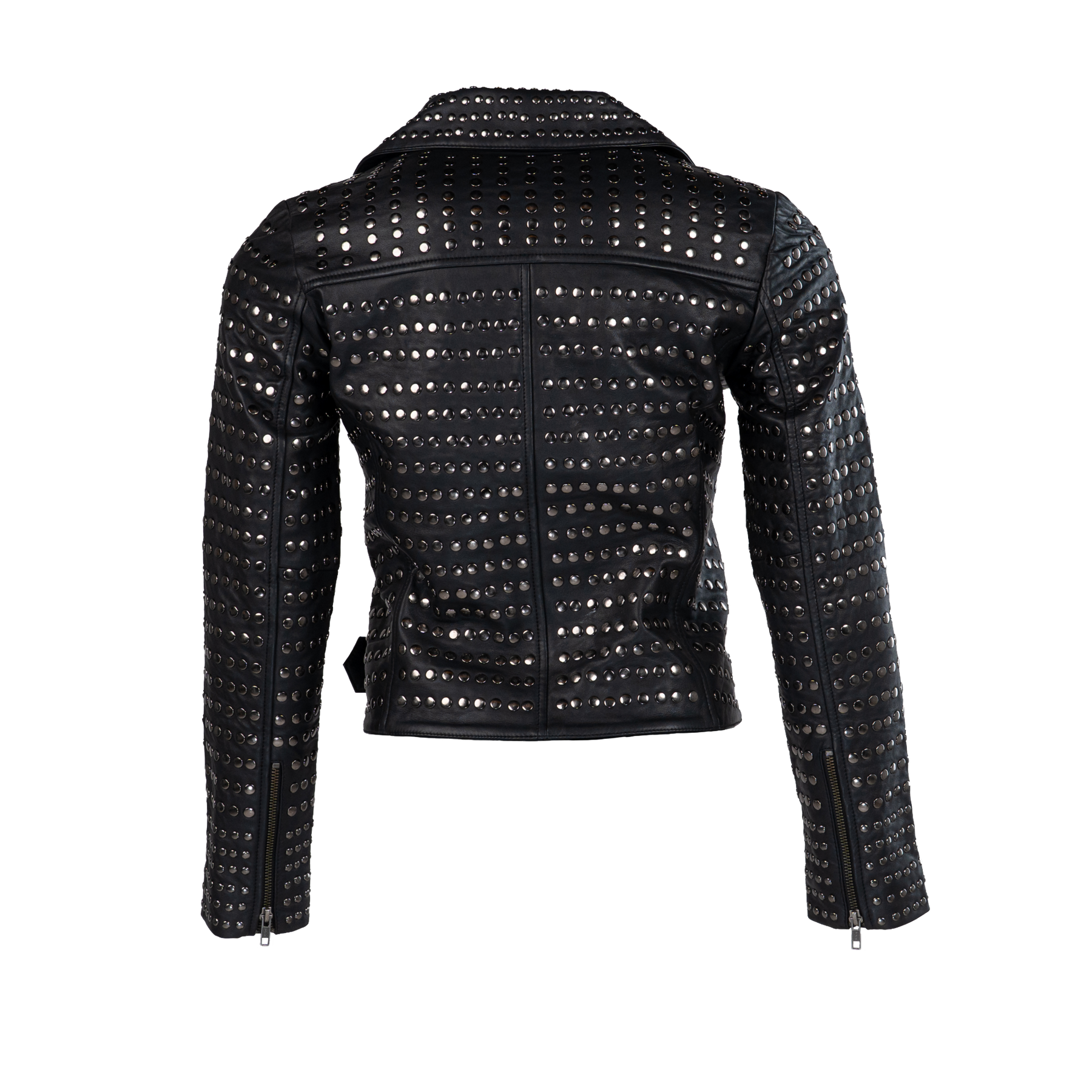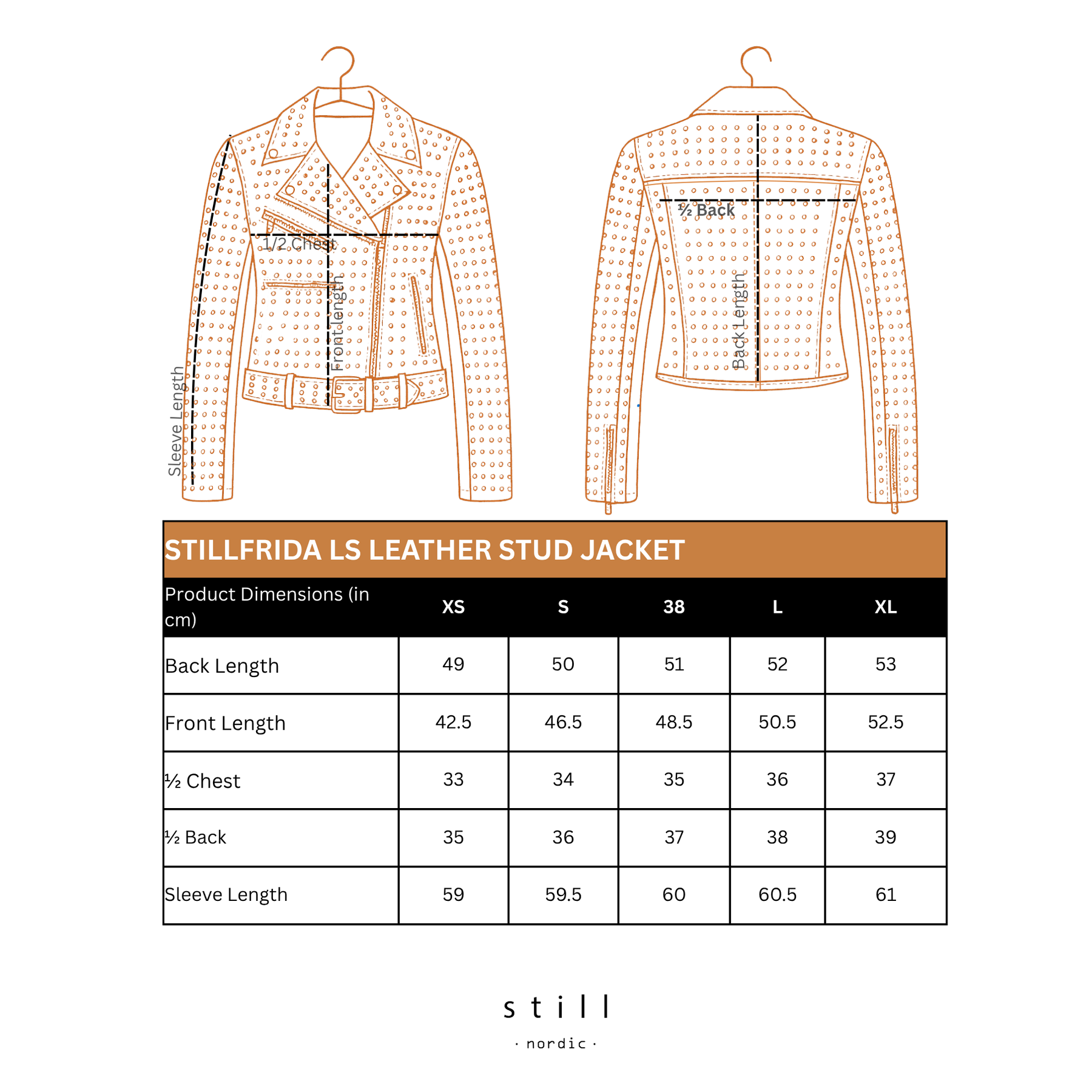 The stillFrida LS Leather Stud Jacket is a stylish women’s jacket, crafted from soft leather for a comfortable and exclusive feel. It features an asymmetrical zip closure, a lapel collar, zippered pockets, a small buttoned pocket, and an adjustable belt. The jacket is adorned with allover studs, adding an edgy detail. Inside, the jacket has one open pocket for practical storage. Finished with slits and zippers on the sleeves, this jacket makes a confident statement for both everyday and evening wear.