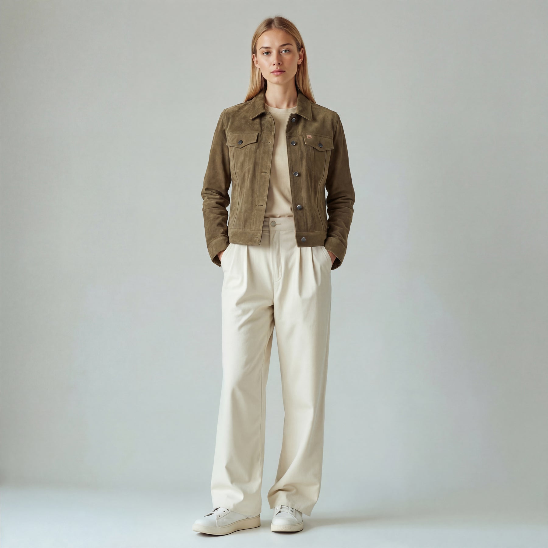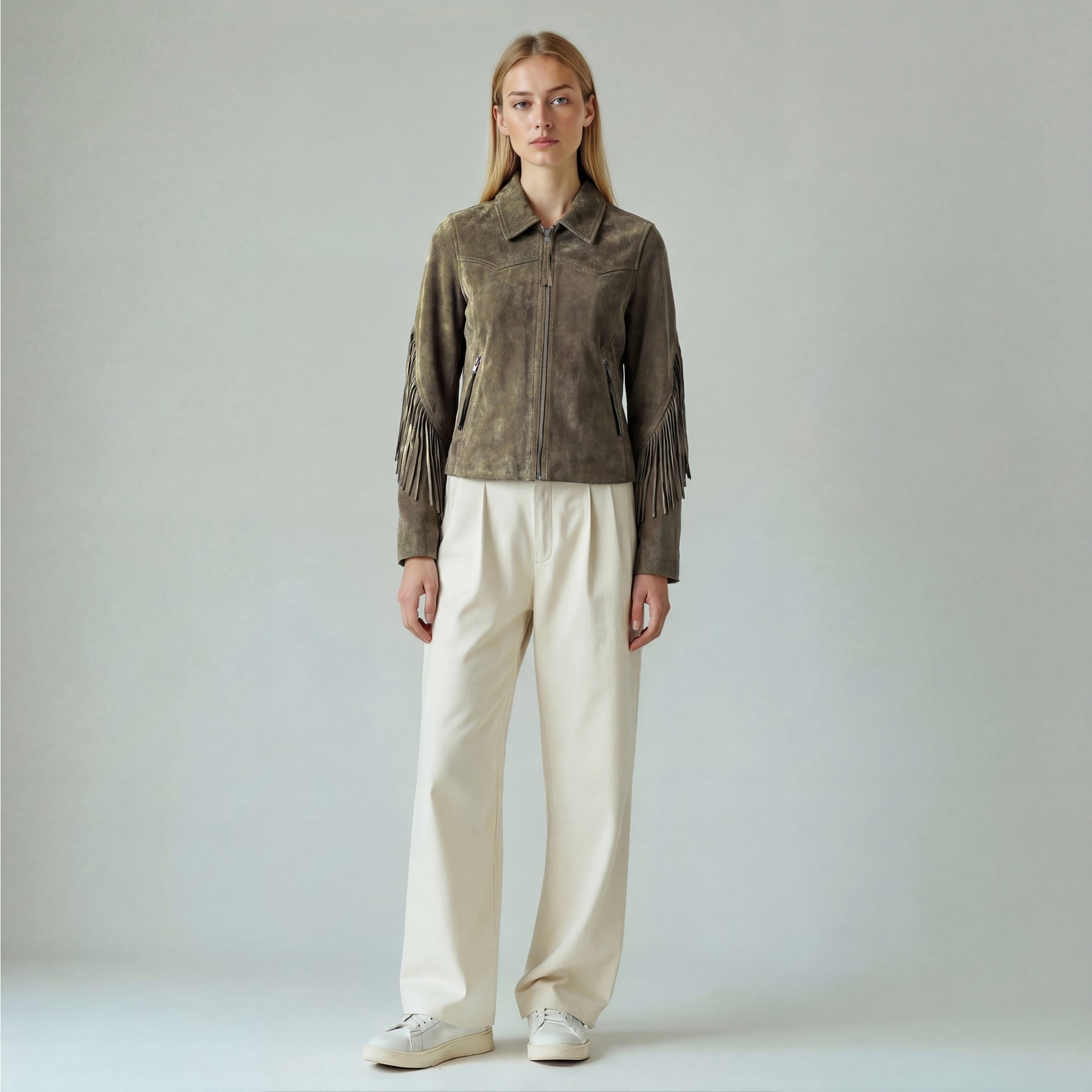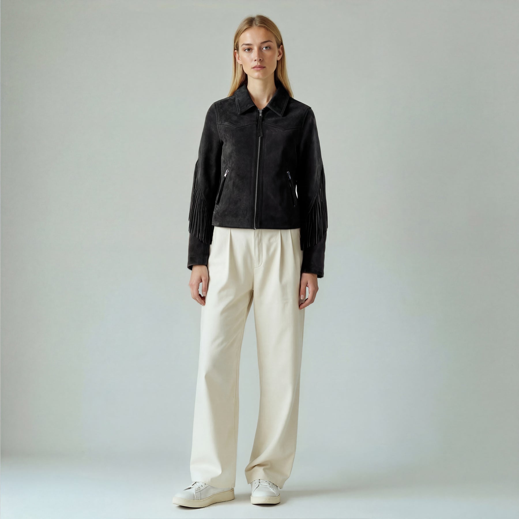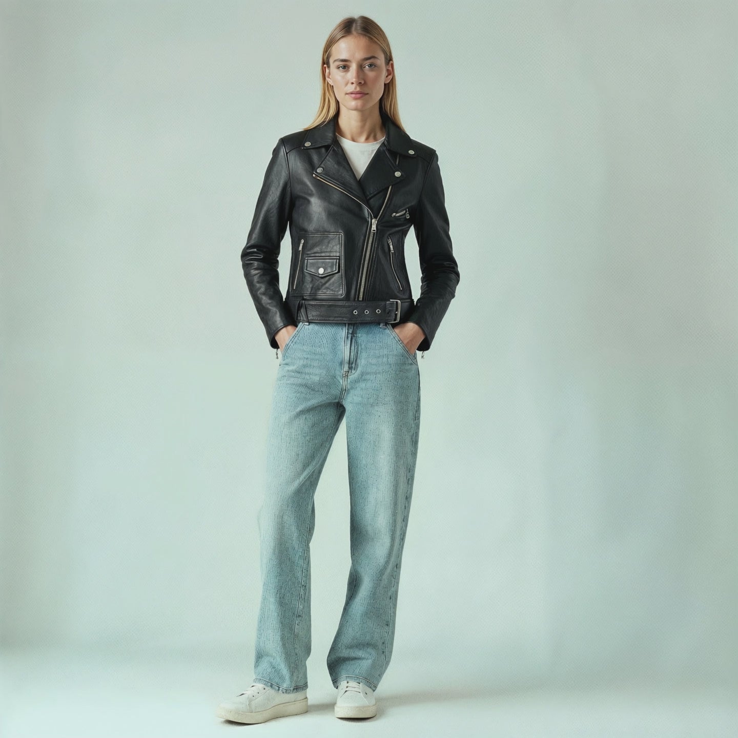 The stillFrida LS Leather Stud Jacket is a stylish women’s jacket, crafted from soft leather for a comfortable and exclusive feel. It features an asymmetrical zip closure, a lapel collar, zippered pockets, a small buttoned pocket, and an adjustable belt. The jacket is adorned with allover studs, adding an edgy detail. Inside, the jacket has one open pocket for practical storage. Finished with slits and zippers on the sleeves, this jacket makes a confident statement for both everyday and evening wear.